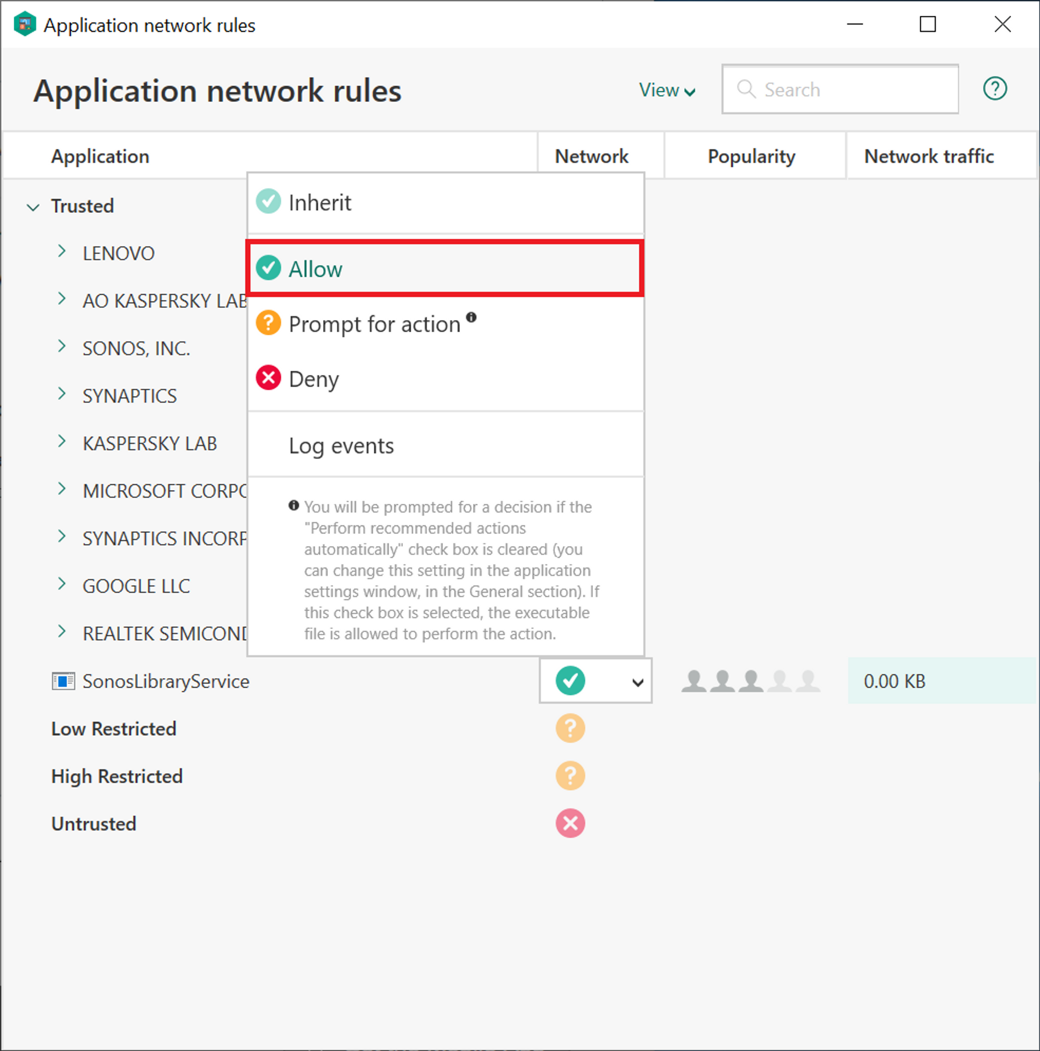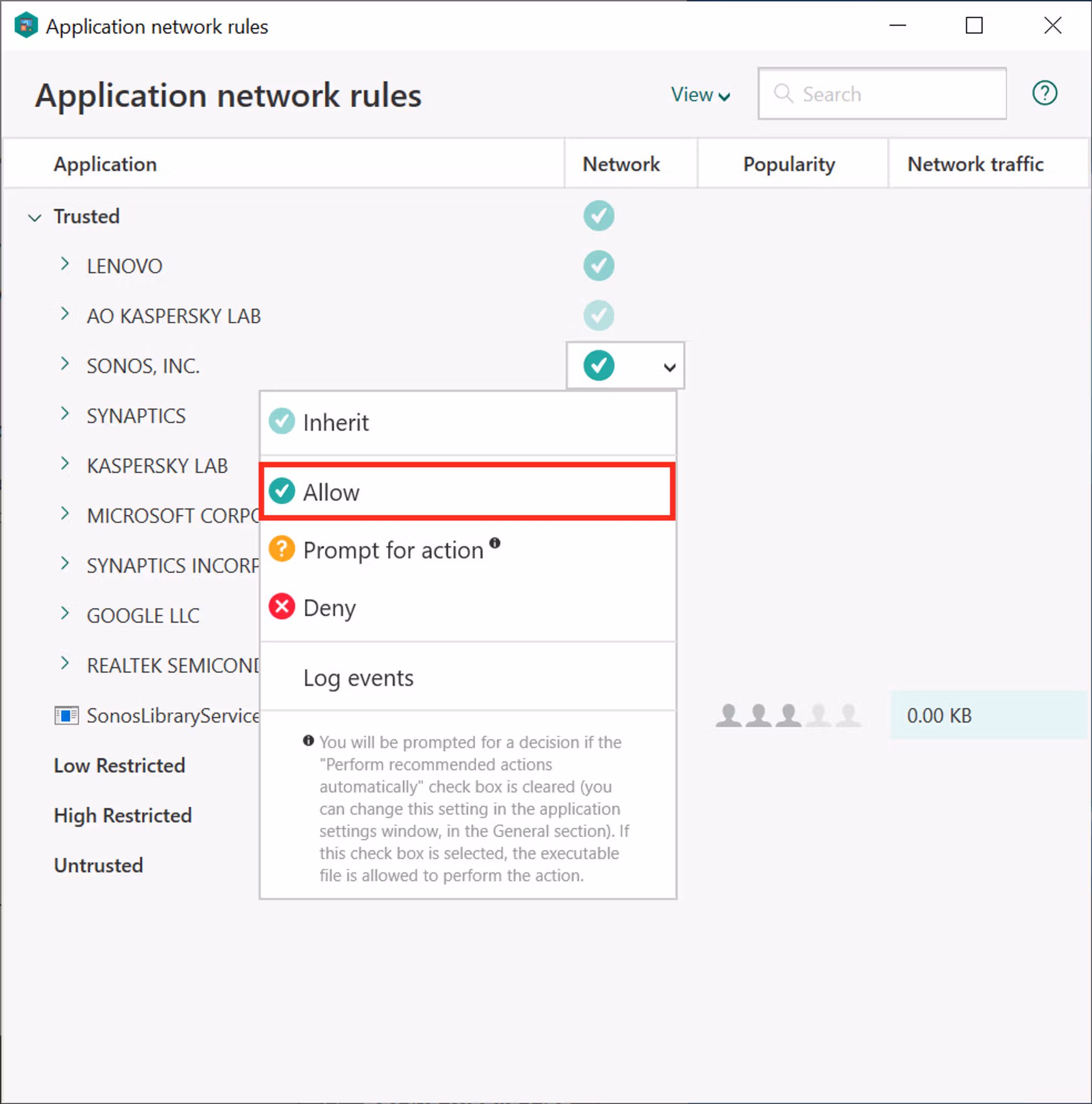 Kaspersky Internet/Total Security is now configured to work with Sonos.