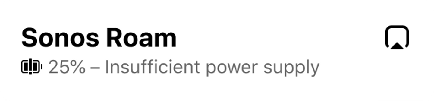 Se si collega Roam a un caricabatterie non sufficientemente potente, l’app Sonos mostrerà il messaggio Alimentazione insufficiente nella scheda Sistema e nel menu Impostazioni di sistema. Ciò si verifica di solito quando Roam viene collegato a un comune caricabatterie per telefoni da 5 V/1 A (5 W).