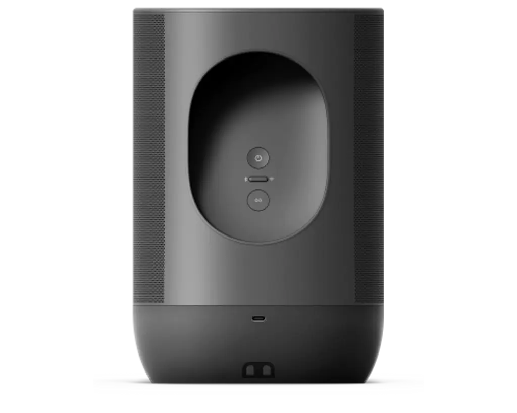 USB-C-porten på Move er plassert på baksiden av høyttaleren over ladekontaktene. Pass på at USB-C-kabelen er satt helt inn i Move og strømkilden. Strømadapteren må være en USB-C PD-lader som gir minst 45 W (20 V / 2,25 A eller 15 V / 3 A). Du kan også bruke en 36 watt-lader som gir minst 12 V / 3 A eller 15 V / 2,4 A, men ladehastigheten blir redusert.